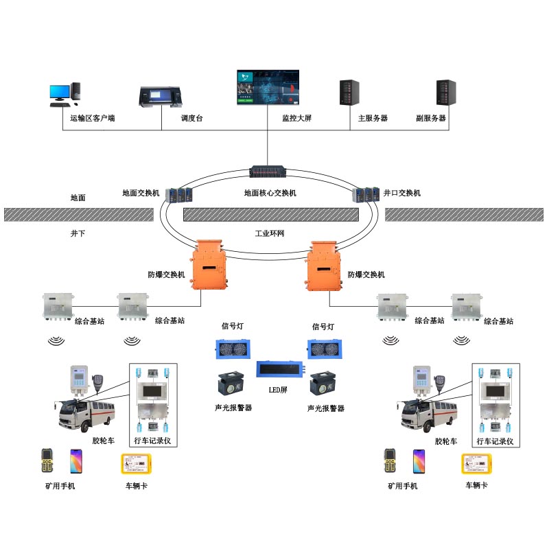 ◆為了更好地實(shí)現(xiàn)對(duì)膠輪車(chē)進(jìn)行調(diào)度,可增加WIFI、4G、5G無(wú)線語(yǔ)音通信系統(tǒng)與無(wú)軌膠輪車(chē)運(yùn)輸監(jiān)控系統(tǒng)配合使用,可以實(shí)現(xiàn)語(yǔ)音通信系統(tǒng)與運(yùn)輸監(jiān)控系統(tǒng)通信干線網(wǎng)絡(luò)共用,有效節(jié)約了礦方投資成本。